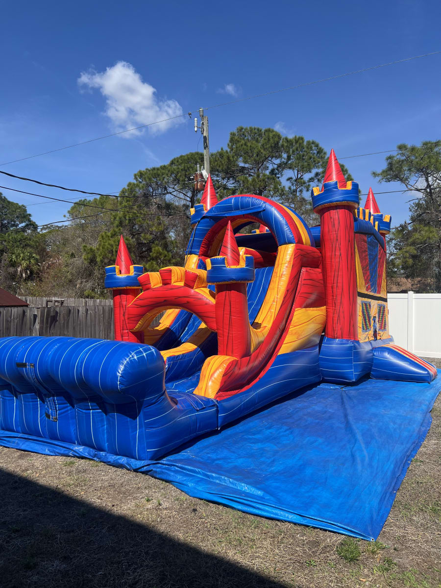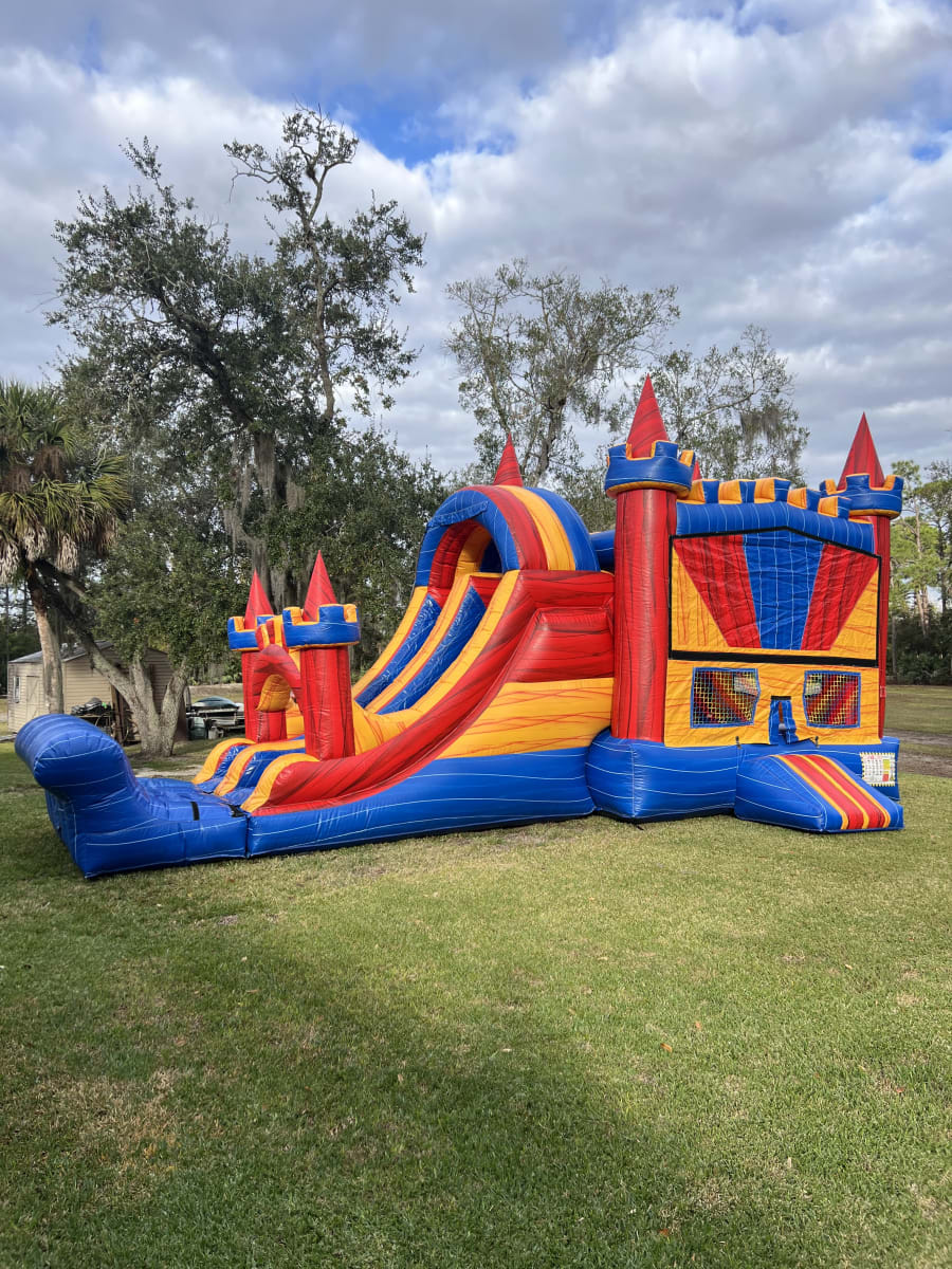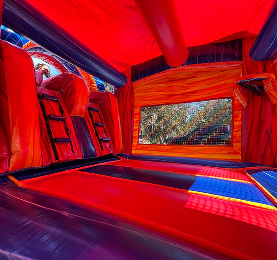 - Jump in the spacious bounce area, shoot some hoops with the interior basketball hoop, and fly down the dual slides.