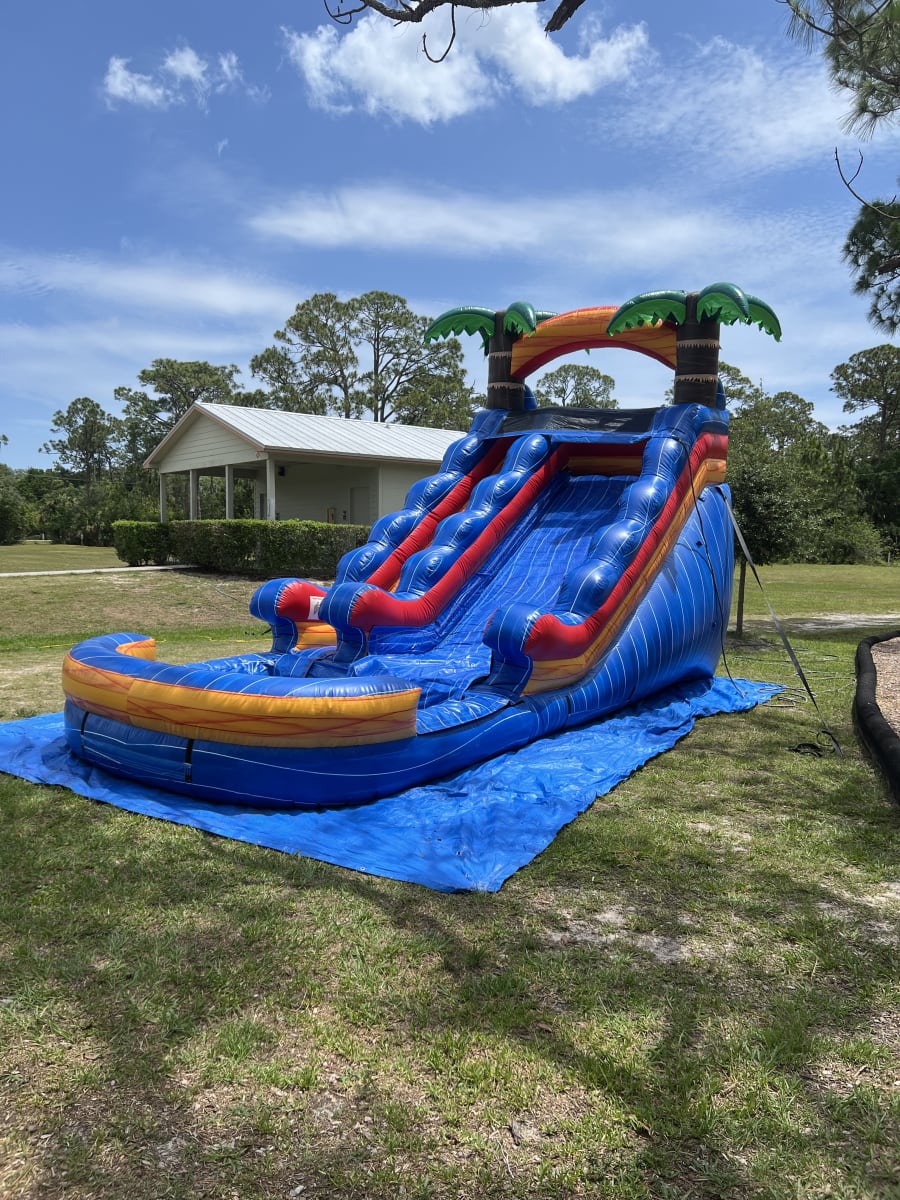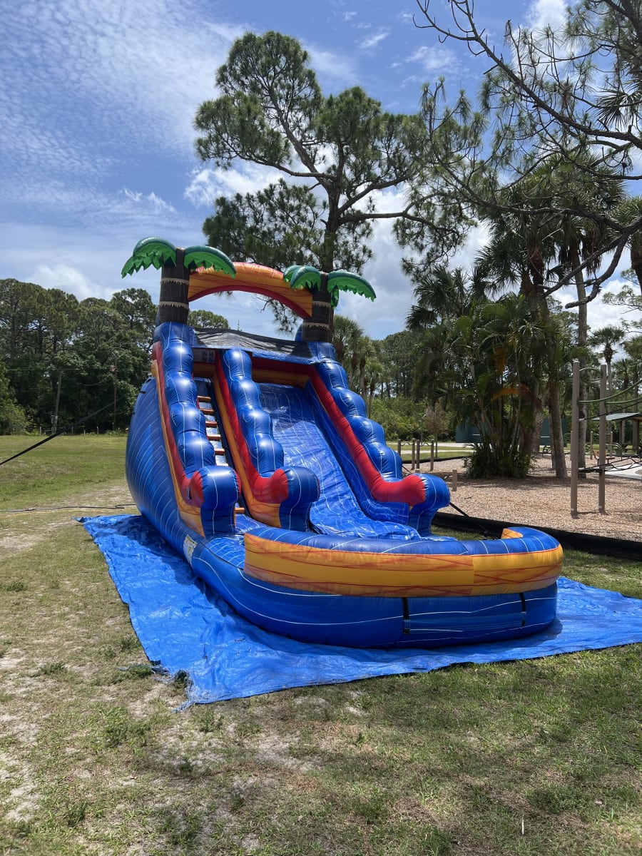 🌴🌊16ft Blue Tropical All Day Rental is the ultimate party starter! With its vibrant marble blue finish and towering palm trees, this slide brings the island vibes directly to your doorstep . Fast, Steep drop for maximum speed and a huge splash pool finish., refreshing, and 16 feet tall—perfect for kids and young teens.